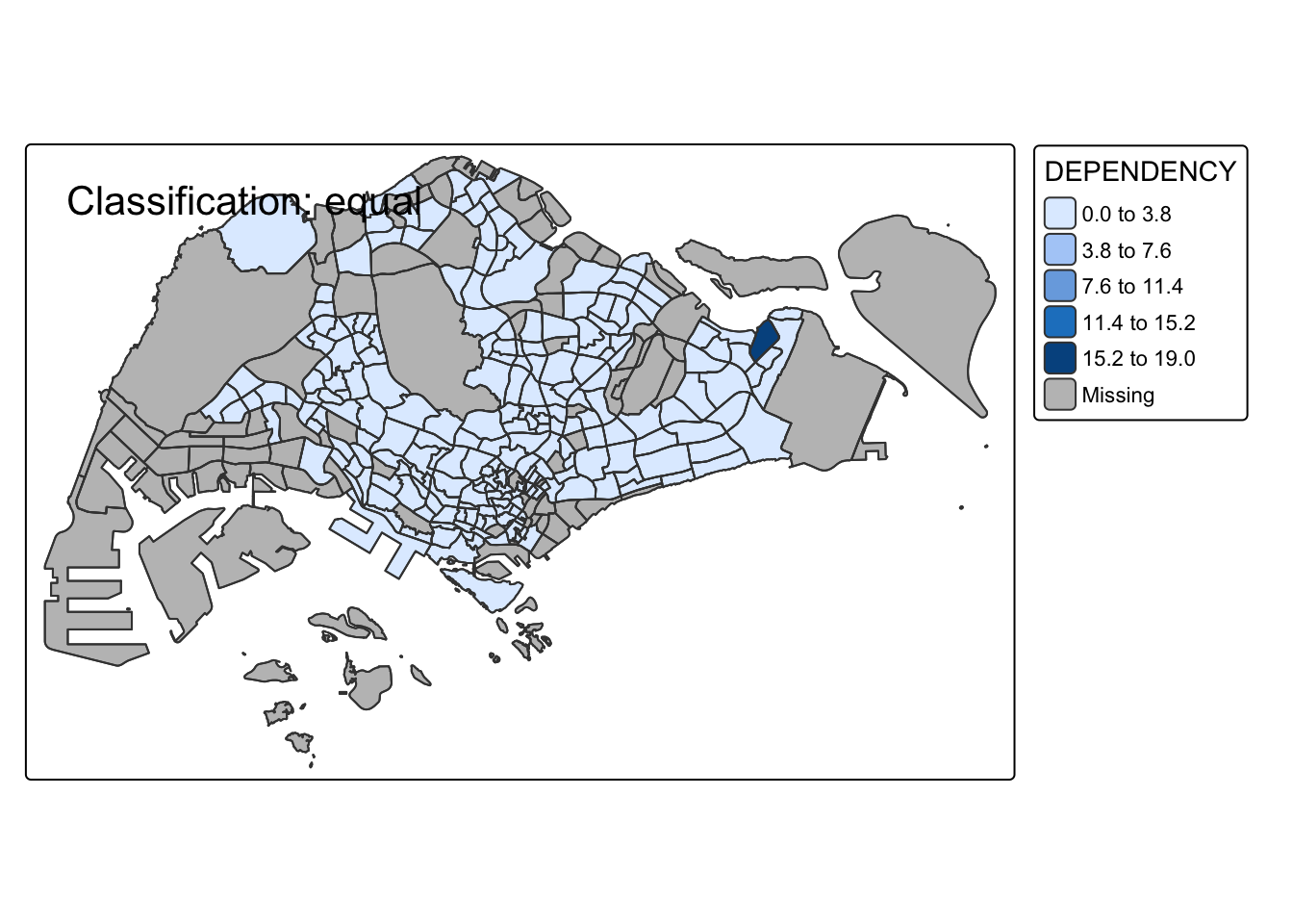 Before we get started, it is always a good practice to get some descriptive statistics on the variable before setting the break points. Code chunk below will be used to compute and display the descriptive statistics of DEPENDENCY field.