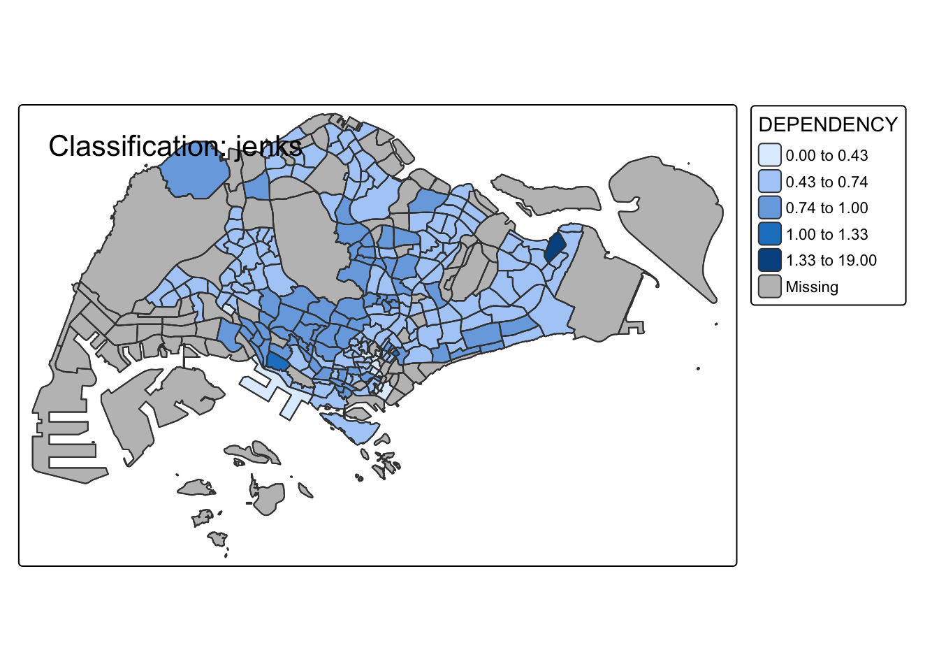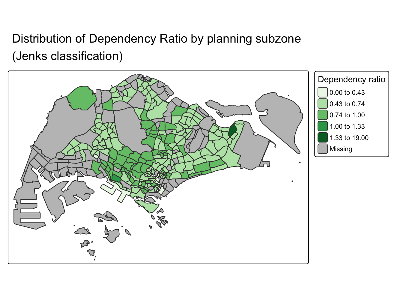 tm_title("Distribution of Dependency Ratio by planning subzone \n(Jenks classification)")